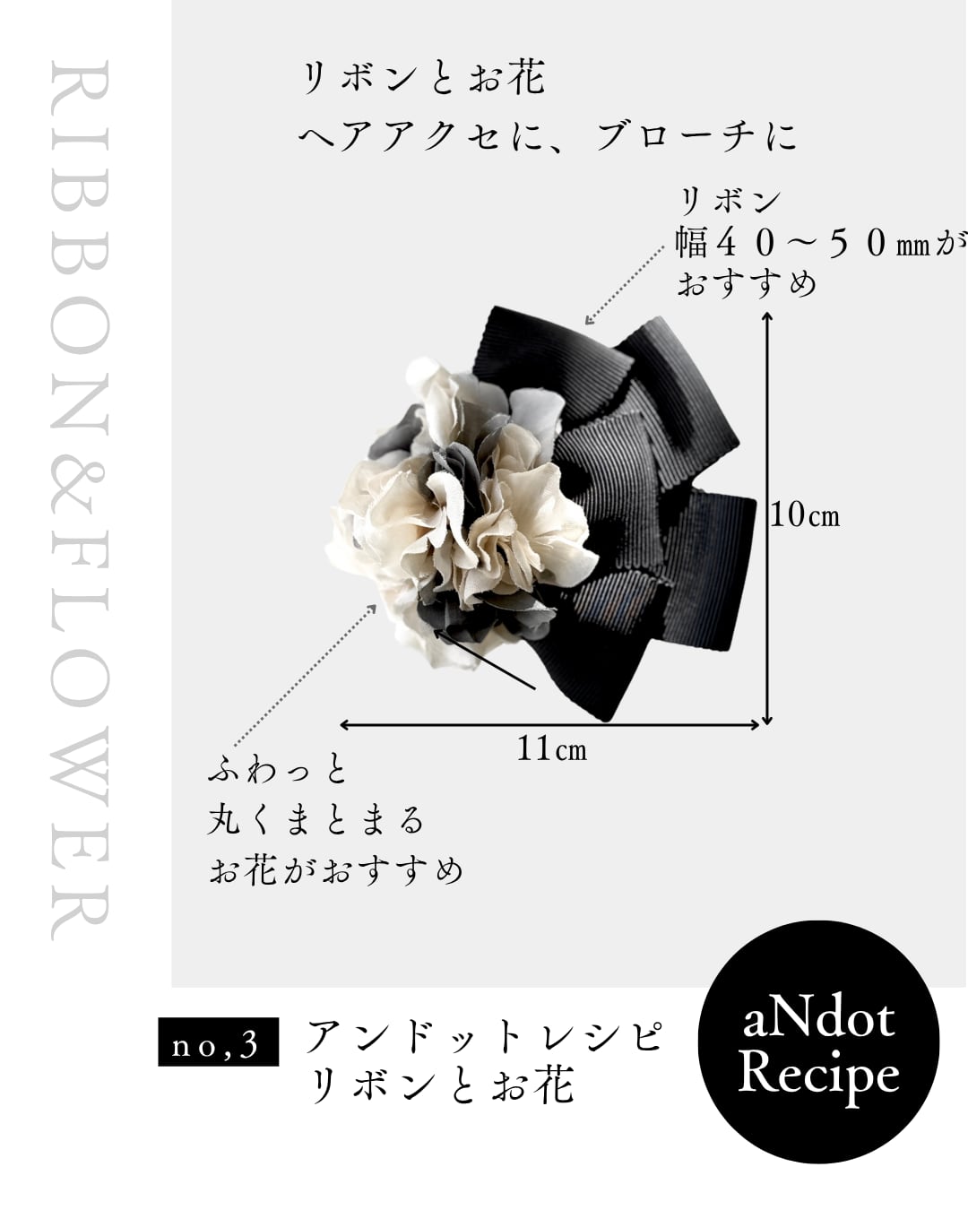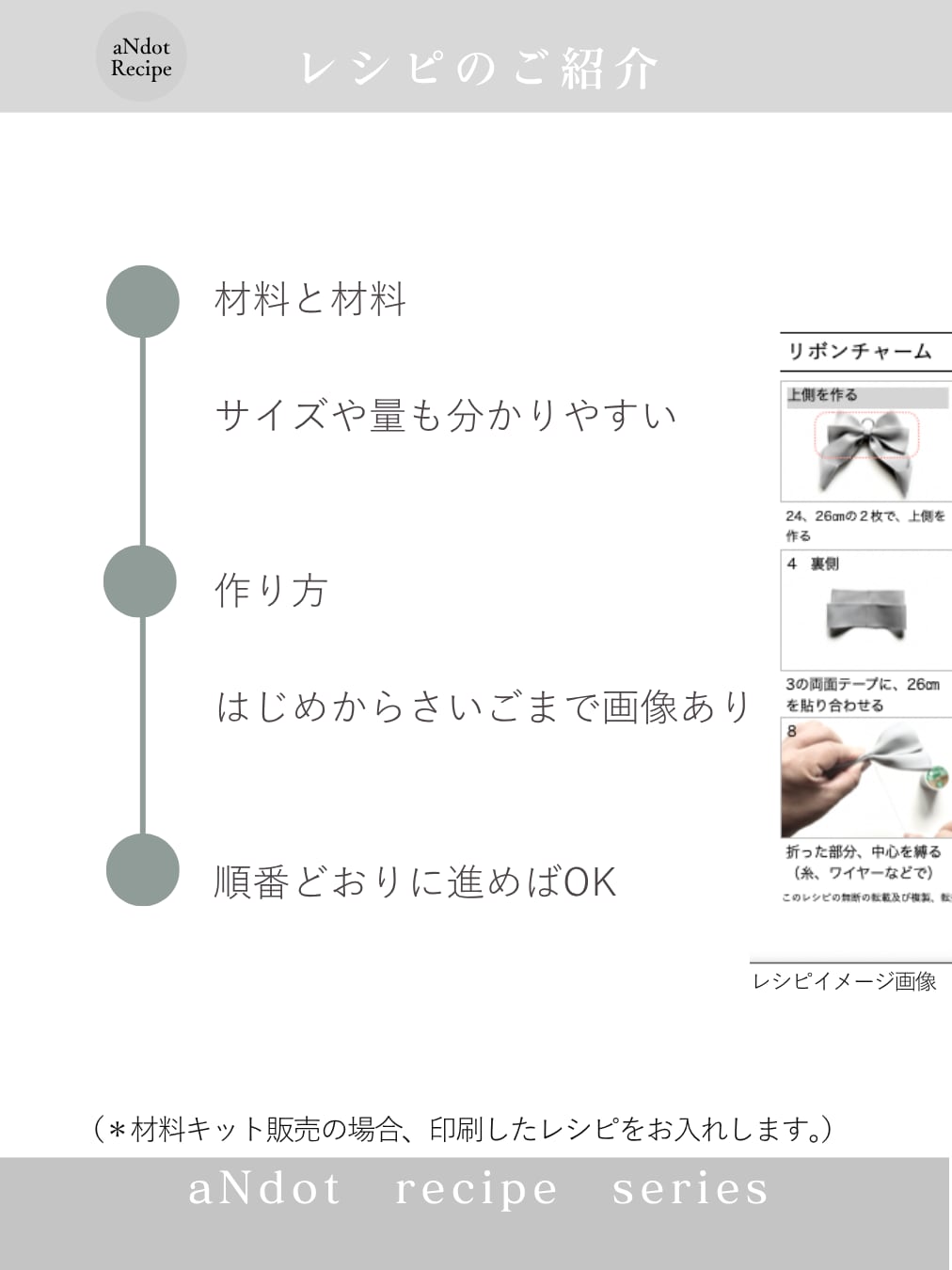 この商品は、リボンコサージュを作るためのレシピ&資材キットです。